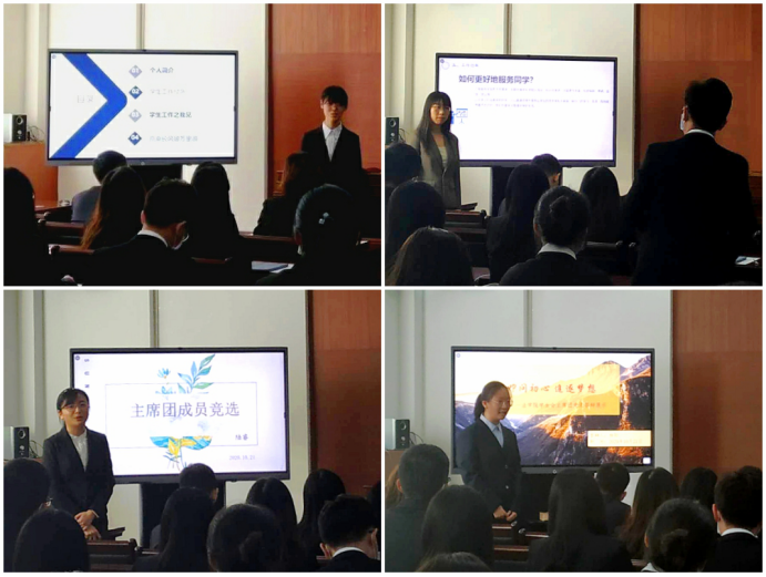大会第四项:学生会主席团候选人竞选答辩崔莹莹、冯晨、高艺函、陆睿、张茜、吴嘉欣、杨阳七位主席团候选人进行了答辩,就自身学生工作经历、个人情况进行了介绍,并对学生会工作提出了很多创新性的想法,答辩后候选人也针对学生代表提出的问题进行了解答。