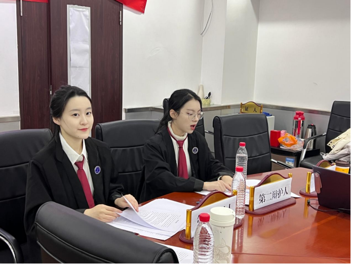 半决赛从早上8:30开始。在法庭调查环节,由于讯问询问环节所费时间超出预估,以及辩方共有3组(8份证据)需补充举证,辩方的时间格外紧张。面对这一问题,第一、第二辩护人与被告人在场上及时协调,保障各自环节所必需的时间,及时删减赛前准备的内容,以在有限时间内向合议庭清晰地呈现辩方的事实版本。在此基础上,随后法庭辩论阶段中,辩方同学集中火力,从客观上涉案金额是否为单位财物,主观上龙昊天是否具有非法占有目的两个方面展开辩论,并根据指导老师的部署与初赛合议庭的建议加强了回应的针对性,增强临场感。在第一个争点中,除充分论证控方指控5400万元的数额为单位财物事实不清、证据不足,没有达到法定证明标准外,第二辩护人又针对控方的回应,指出控方指控的数额本身也不严谨,应为5325.4万元而非起诉书所写的5400万元。在第二个争点的一轮里,在阐明辩方观点的同时,第二辩护人又针对性地指出控方论证颠倒排除意思和利用意思的判断顺序的问题。半决赛遇到的队伍实力强劲(东道主湘潭大学队),其队员输出稳定,且时间紧张,对辩方同学而言是一次很大的锻炼。最终,辩方成功胜出(2:1),顺利挺进决赛。