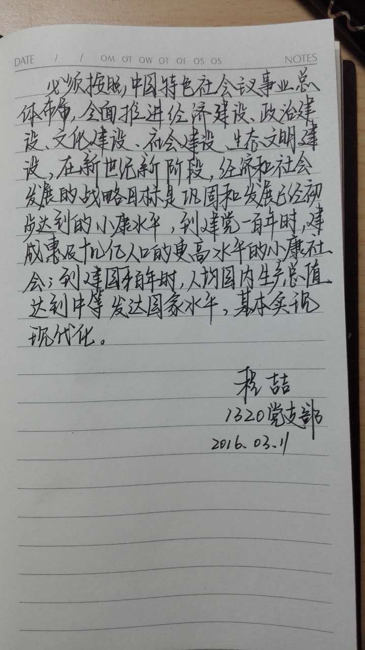 党章全文共一万五千多字,每天平均抄150字左右,计划100天抄完。1320党支部还依托本支部的党建学习微信平台,发动入党积极分子、干部群众一起分享心得、互相促进;并结合《人民日报》“学习小组”微信平台的互动,将每天抄写的内容,用手机拍照上传,与更多党员一起学习交流。