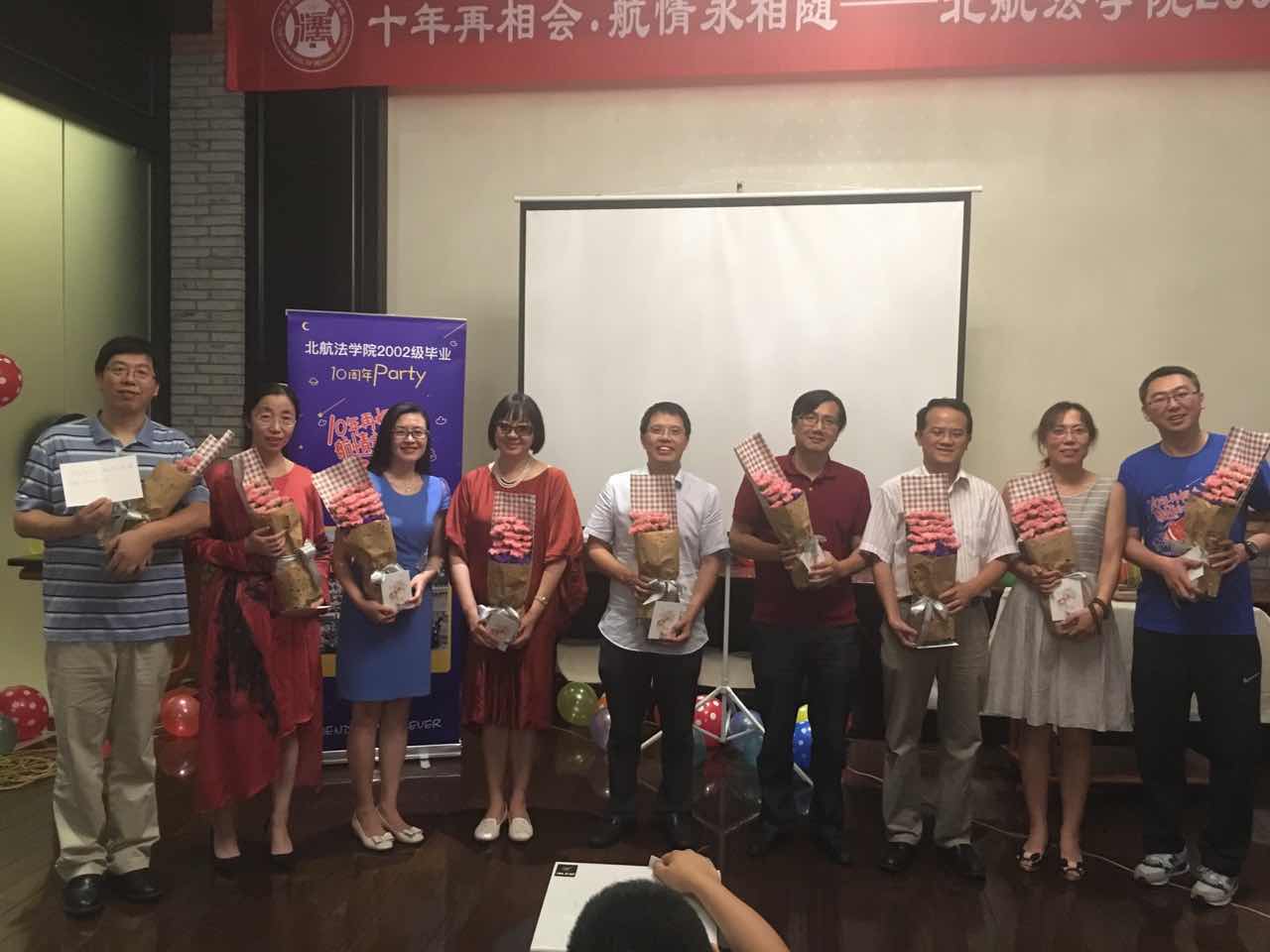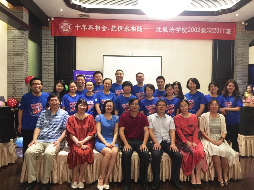 2016年9月10日,北航法学院2002级本科生毕业十周年庆典晚会在京隆重举行。法学院院长龙卫球、党委书记王琪全、322011班班主任李亚梅、辅导员杨勇以及任自力、罗昶、王丽、高国柱、岳悍惟等任课老师和同学们欢聚一堂,共同庆祝。晚会以感恩、感动为基调,老师们和同学们纷纷致辞并进行游戏互动,师生情与同学情溢于言表,现场欢声笑语不断,气氛热烈。