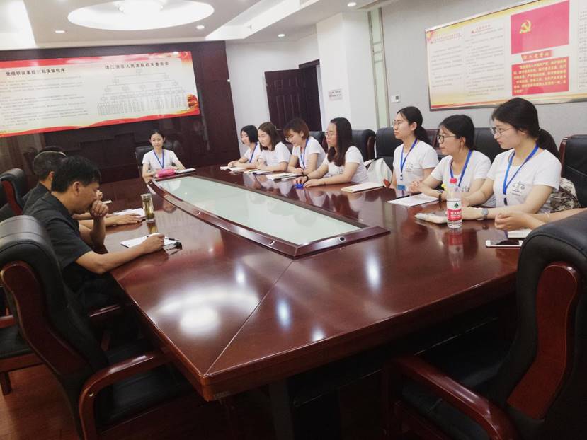 院党组成员、政治处主任王炳连、人事科科长蒋兴忠以及蒋同一主任亲切地接待了同学们,并由王炳连主任主持召开了迎接座谈会。会上,王炳连主任对同学们的到来表示欢迎,首先介绍了淮安地区的风土人情,其后对法院概况也做了简要展示:淮安市清江浦区法院由淮安市清河法院和淮安市清浦法院合并而成,拥有二十余个部门,在编行政人员202名左右,还拥有一大批聘任制的书记员,总共350名左右,处理的案件多达两万多起,其中民商事案件较多。